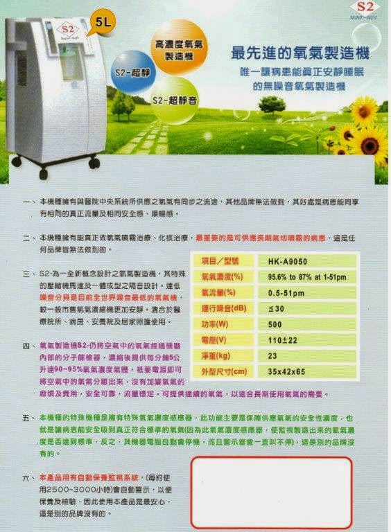 | 台北市大同區長安西路82號5樓之3 E-MAIL:everkosfa@gmail.com TEL:02-29588800 FAX:02-25587417 聯絡人:李先生 0928254828 一、本機種擁有與醫院中央系統所供應之氧氣有同步之流速,其他品牌無法做到,其好處是病患能同享有相同的真正流量及相同安全感、順暢感。 二、本機種擁有能真正做氧氣噴霧治療、化痰治療,最重要的是可供應長期氣切噴霧的病患,這是任何品牌皆 三、S2-為一全新概念設計之氧氣製造機,其特殊的壓縮機馬達及一體成型之隔音設計,達低噪音分貝是目前全世界噪音最低的氧氣機 較一般市售氧氣濃縮機更加安靜。適合於醫療院所、病房、安養院及居家照護使用。 四、氧氣製造機S2-仍將空氣中的氧氣經過機器內部的分子篩檢器,濃縮後提供每分鐘5公升達90~95%氧氣濃度氣體,祇要電源即可將空氣中的氧氣分離出來,沒有加罐氧氣的麻煩及費用,安全可靠,流量穩定。可提供連續的氧氣,以適合長期使用氧氣的需要。 五、本機種的特殊機種是擁有特殊氧氣濃度感應器,此功能主要是保障供應氧氣的安全性濃度,也就是讓病患能安全吸到真正符合標準的氧氣(因為此氧氣濃度感應器,使監視製造出來的氧氣濃度是否達到標準,反之,其機器電腦自動會停機,而且警示器會一直叫不停),這是別的品牌沒有的。 六、本產品擁有自動保 |